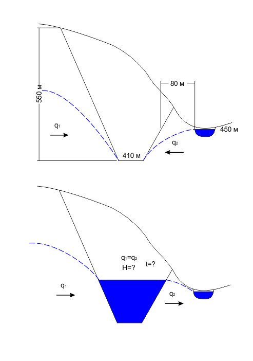 Есть карьер, расположенный склоне небольшой горы (высотой примерно 800 метров). Глубина карьера составляет 550 м (абсолютная отметка дна карьера равна 410 м). Под горой протекает река с абсолютной отметкой уреза — 450 м. Расстояние от карьера до реки в среднем составляет 80 м. Периметр подгорной части карьера равен 100 м. Особенности рельефа нагорной части позволяют утверждать, что все атмосферные осадки в пределах области водосбора за вычетом испарения будут поступать только в карьер при любом уровне воды в нем. Области подземного и поверхностного водосбора совпадают. Водоупор находится на глубине 550 м и что важно — рельеф его кровли полностью повторяет рельеф поверхности.